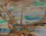 2005Pelikanen is een aquarel met de bedoeling om de weerspiegeling in het water weer te geven.