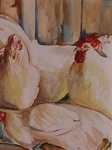2005Kippen is een aquarel met kippen in diversen standen in een kippenhok