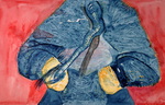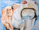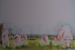 2008Schapen in het rood is een aquarel waarbij het rood van de schapen je blikt vangt